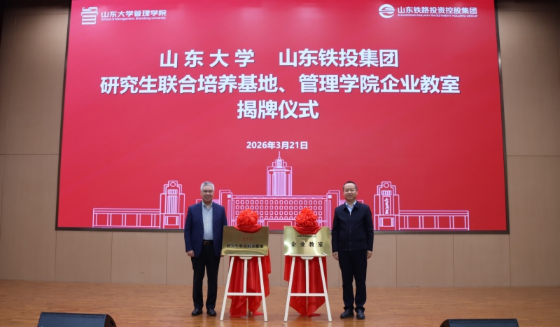 3月21日上午,山东大学、山东铁投集团研究生联合培养基地及管理学院企业教室揭牌仪式在济南举办,旨在深化产教融合、推动校企合作,为协同推进人才培养、科研攻关、成果转化搭建专业平台。山东铁投集团党委书记、董事长王卫中,党委副书记、董事乐江华;山东大学财务部部长路军伟,管理学院党委书记付岩志、院长丁荣贵出席仪式。