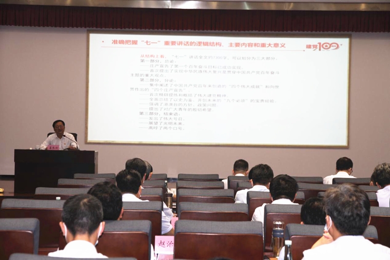 姜长兴结合个人所学所闻、所思所悟,深入解读了习近平总书记“七一”重要讲话的逻辑结构、主要内容和重大意义,详细阐释了讲话中提出的一系列新思想新观点新论断,重点阐述了中国共产党百年来创造的“四个伟大成就”和向世界作出的“四个庄严宣告”。大家边听边思考,进一步加深了对习近平总书记“七一”重要讲话精神的理解,感悟了思想、鼓舞了斗志、汲取了力量,增强了“四个意识”、坚定了“四个自信”。