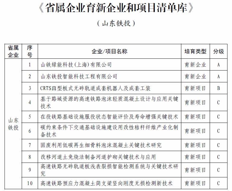 近日,山东省属企业“育新行动”首批入选名单正式公布,山东铁投集团权属智能科技工程有限公司(以下简称“智科工程公司”)、山铁绿能科技(上海)有限公司(以下简称“山铁绿能公司”)双双入选A类育新企业,“CRTSⅢ型板式无砟轨道成套机器人及成套工装”项目成功入选B类育新项目,另有7个项目入选C类育新项目。